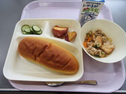 <中華煮 大学いも あっさりきゅうり パンプキンパン 牛乳>