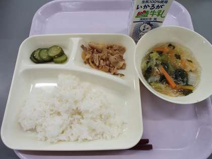<豚肉のコチジャン炒め 鶏肉とはるさめのスープ きゅうりのナムル ごはん 牛乳>