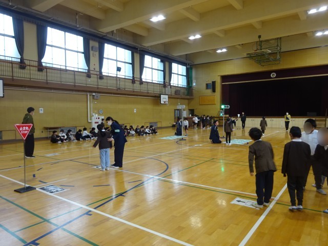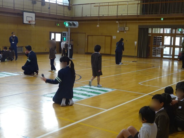 2時間目に1年生から3年生の交通安全教室がありました。生野警察署のみなさんにご協力いただき、正しい歩行の仕方を中心に交通安全について教えていただきました。