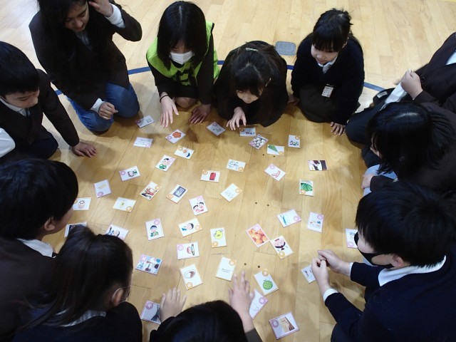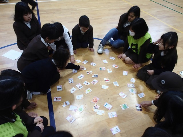 今日の児童集会は給食委員会の発表でした。給食委員会が作成した給食カルタを班のみんなで遊んで楽しみました。