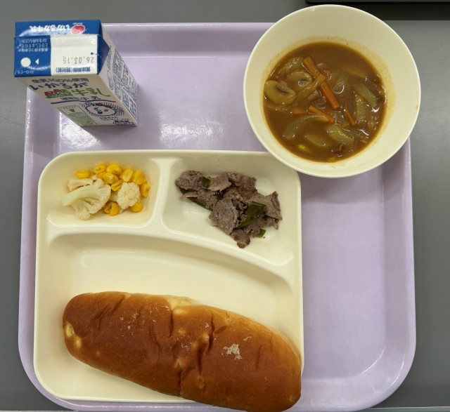 <カレースープ 豚肉の香味焼き カリフラワーとコーンのサラダ おさつパン 牛乳>