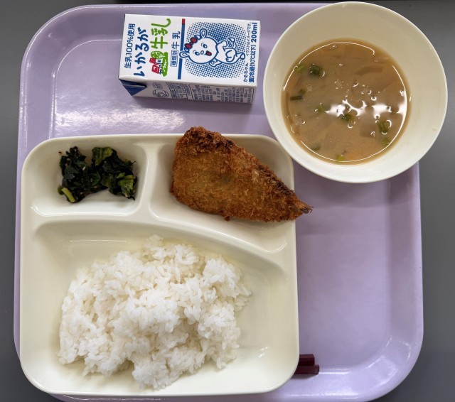 <いわしフライ みそ汁 ほうれんそうのごまあえ ごはん 牛乳>