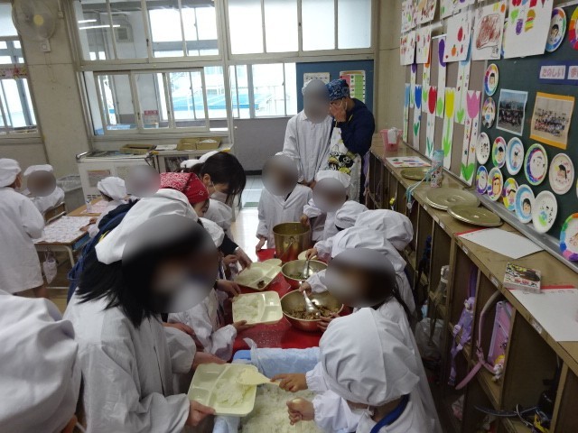 6年生にお手伝いしてもらいながら給食準備をしています。日に日に上手になってきています。