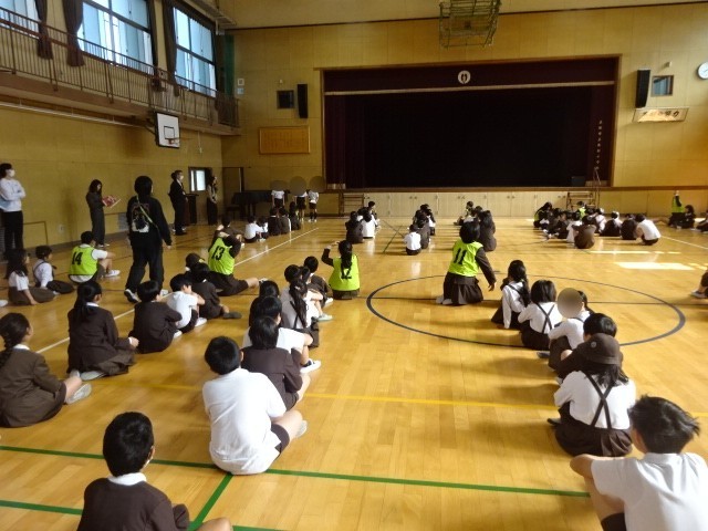 児童集会でワクニコ班の顔合わせ・自己紹介をしました。6年生は班長として話し合いを進めることができました。