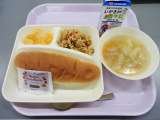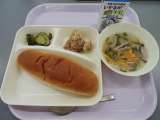 <鶏肉のからあげ ハムととうがんの中華スープ きゅうりのピリ辛あえ 黒糖パン 牛...
