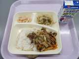 <牛丼(ごはん) もやしとピーマンのごまいため 大福豆の煮もの 牛乳>
