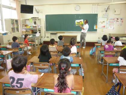今朝は、一年の教室で絵本の読み聞かせをしました。