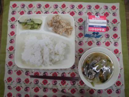 今日の献立は、「鶏肉のから揚げ、中華スープ、チンゲンサイともやしの甘酢あえ、ごはん、牛乳」でした。