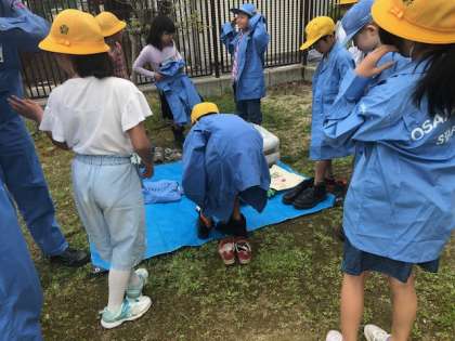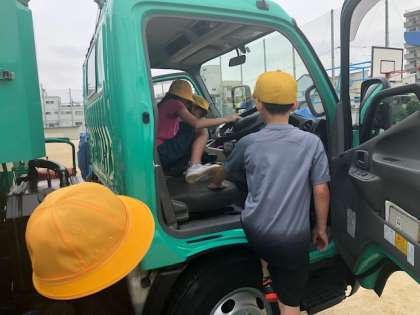 実際のパッカー車を見ながら、いろいろな説明を聞いたり、パッカー車に乗せていただいたり、作業服や作業靴を着せていただりしました。