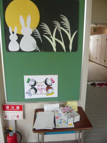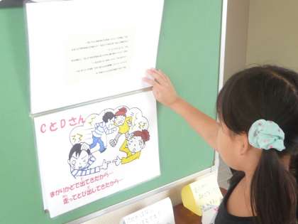保健室前に掲示してあったり、置いてあったりしてあるものを子どもが見ています。