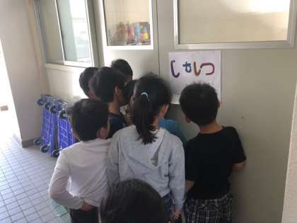 今日は、1年生が学校探検をして回りました。