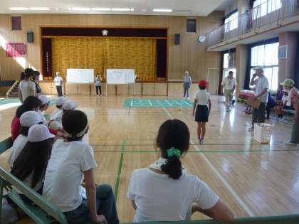 6チームを二つに分け、3チームずつの総当たりリーグ戦を行い、それぞれのリーグの1位、2位、3位同士で順位決定戦を行いました。保護者の皆様も、ゲームを重ねるうちに慣れてきて、各勝負は、接戦になり大いに盛り上がりました。子ども達、保護者の皆様、地域・見守り隊の皆様、みんなの笑顔でいっぱいになりました。
