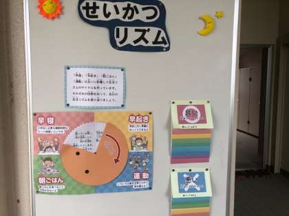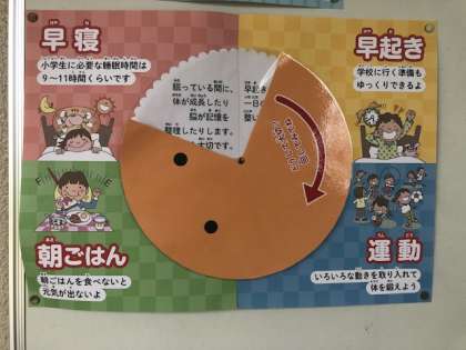 保健室近くの掲示板に、生活リズムに関する掲示物があります。