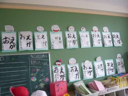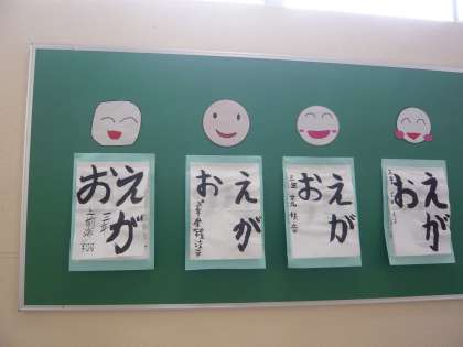 3年生の学年掲示版には、書写で「えがお」がニコニコ笑顔のイラストと一緒に掲示されていました。教室の掲示板にも掲示していました。