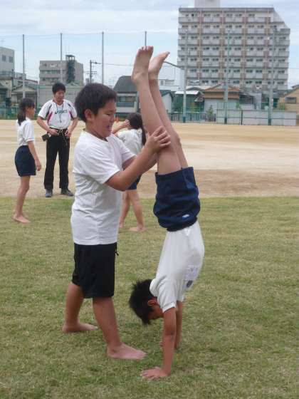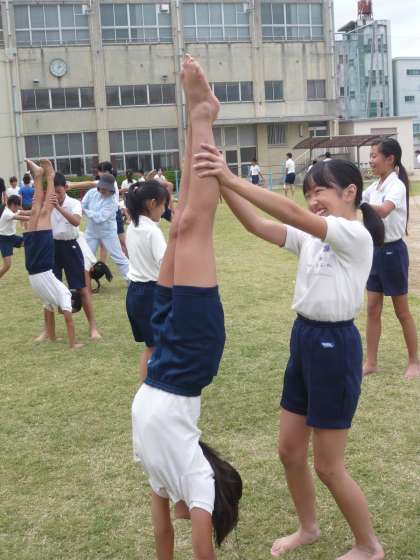 昨日は、放課後に6年生女子が倒立の練習などをしていました。
