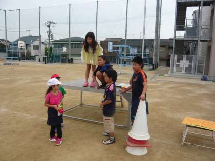 運動場で、各縦割り班ごとにスプーンリレーをしました。