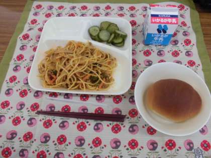 今日の給食の献立は、「スパゲティミートソース、きゅうりのバジル風味サラダ、パン、牛乳」でした。