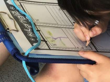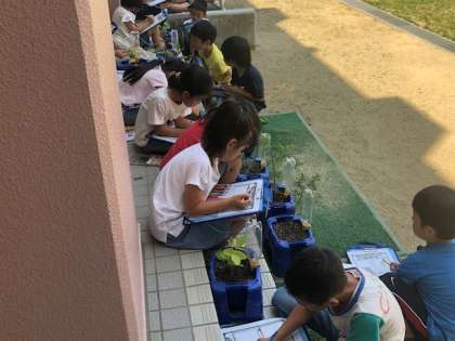 今日はみんなで観察をして記録を残します。花や葉の様子をよく見たり、でき始めた実の匂いをかいだり、子ども達は細かいところまで観察して記録していました。