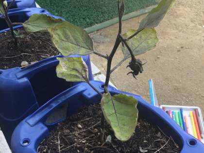 2年生が鉢で育てている「きゅうり」「なす」「いんげんまめ」「ミニトマト」に少しずつ実ができ始めてきました。