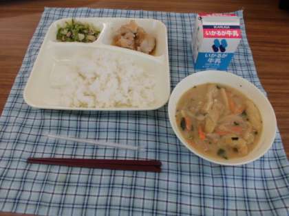 今日の給食の献立は、「鶏肉のおろしじょうゆかけ、みそ汁、野菜いため、ごはん、牛乳」でした。鶏肉のおろしじょうゆかけは、おろし醤油が大変さっぱりして、暑い時期にぴったりの味付けでした。