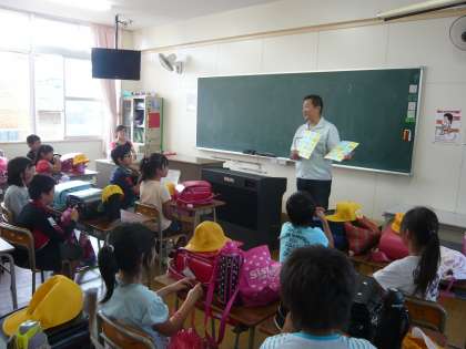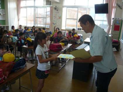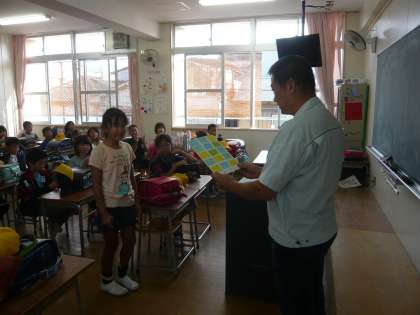 代表の大山様に連絡すると、終わりの会の時間に合わせて学校に駆け付けてくださり、いろいろなことを通してコミュニケーションの大切さについて話していただきました。