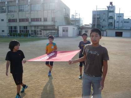 国旗、校旗、優勝旗、等々それぞれに注意するポイントを確認しながら行進練習をしています。旗をピンと張ったり、姿勢をよくしたり、行進のリズムを合わしたり、注意点は、いっぱいあります。