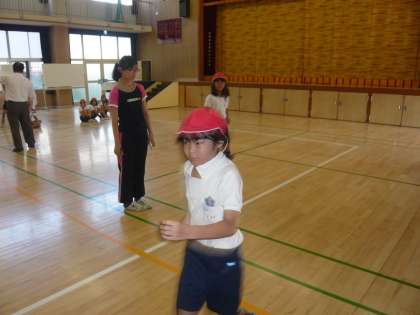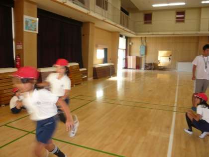 運動会全体練習が終わった後、4年生赤組の子どもたちがリレーのバトンパスの練習をしていました。