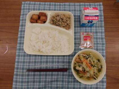 今日の給食の献立は、「ゴーヤチャンプルー、すまし汁、あつあげのしょうがじょうゆかけ、ごはん、牛乳」でした。「チャンプルー」とは沖縄県の方言で「ごちゃまぜ」という意味で、いろいろな食材を炒めた料理です。今日の給食では、「夏野菜の王様」と言われる苦瓜(ゴーヤ)を使っています。子ども達にも食べやすく味付けされていて、大変おいしくいただきました。