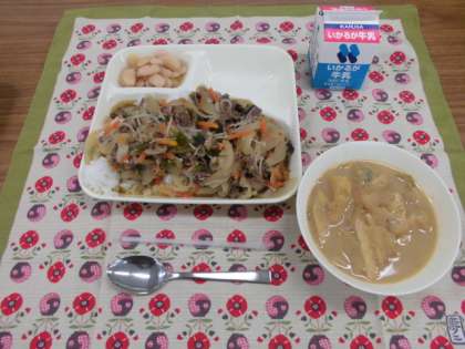 大福豆は、北海道のいぶり地方や北見地方で栽培されている豆です。今日は煮物でいただきました。牛丼は汁もたっぷりで子ども達にも大人気でした。