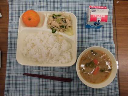 今日の給食の献立は、「ピリ辛野菜炒め、オクラトン汁、冷凍みかん、ごはん、牛乳」でした。今日の献立は、学校給食献立コンクールの優秀作品です。