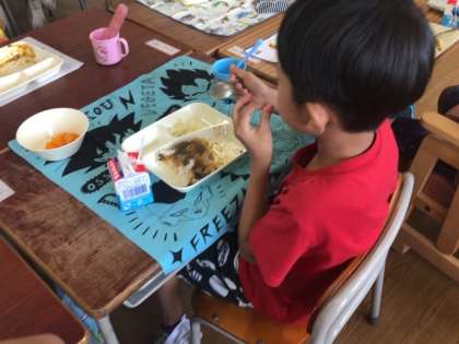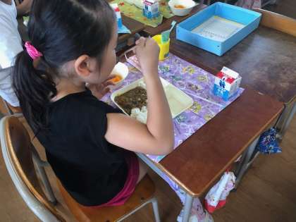 やっぱりカレーライスは子ども達に大人気。しかも今日のカレーライスには、なすやかぼちゃ、ピーマンなどの夏野菜がふんだんに入っていました。