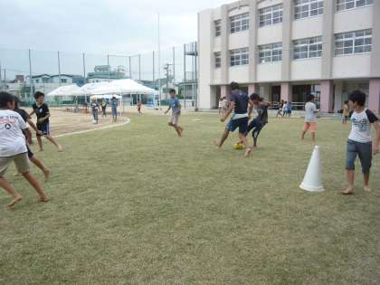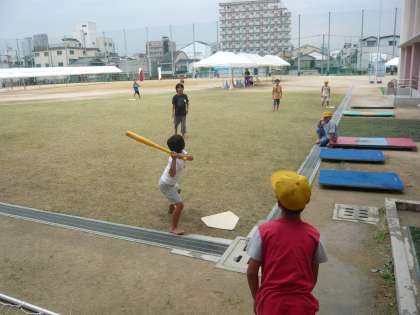 やわらかいボールとバットを使って、野球をしたりカラーコーンをゴールに見立てて、場所を変えてサッカーをしたりしています。