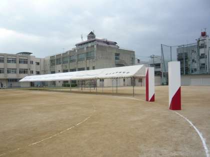 また、児童席のテントは、合計6張りですが、応援団や係の児童も全員テント内に席を設けました。それにともなって、入退場門と児童席テントの間に準備物を置くスペースを設けました。