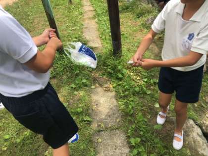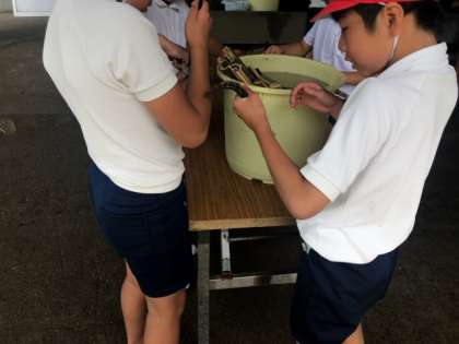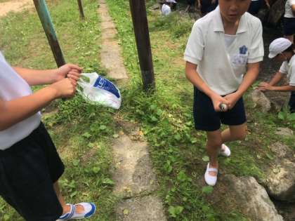 わーきゃーと言いながら魚を捕まえています。捕まえた魚はスタッフの方に焼いていただきます。