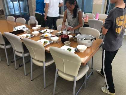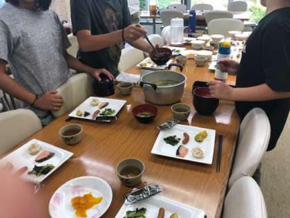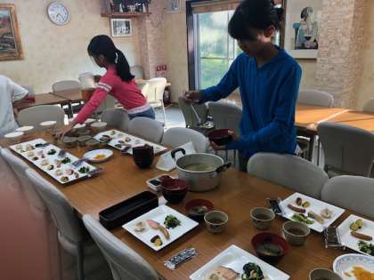 食事係が朝食の用意です。てきぱき準備が進みます。
