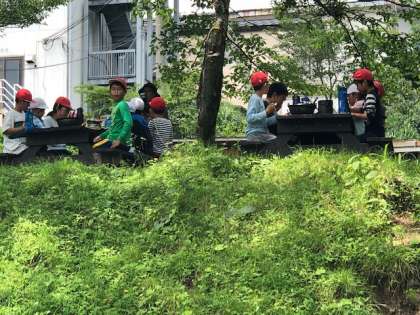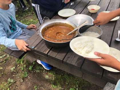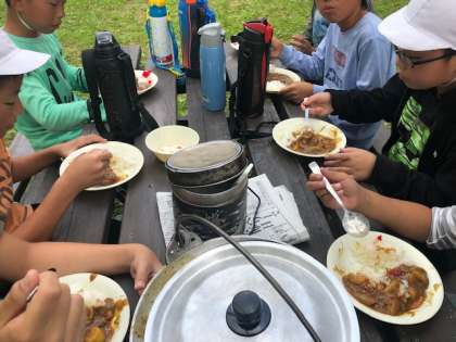 カレーライスが出来上がりました。みんな本当に美味しくいただいています。どの班も大成功です。