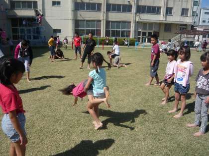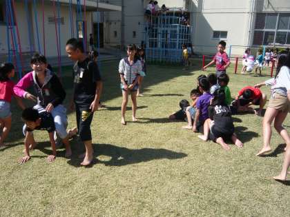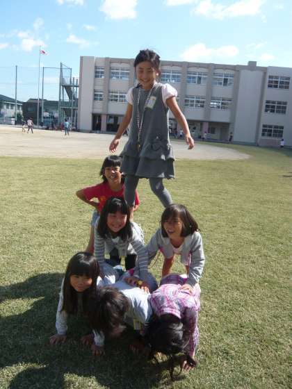 低学年も高学年も混じって、芝生で組体操?をしていました。