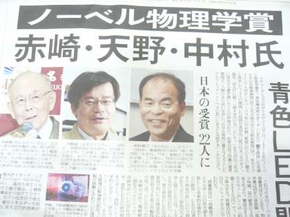 朝刊一面のトップは、「ノーベル物理学賞 赤崎・天野・中村氏」(讀賣新聞)でした。各紙とも同じだと思います。