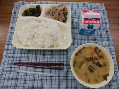 今日の給食の献立は、「豚肉の甘辛焼き、みそ汁、オクラのおかかいため、ごはん、牛乳」でした。