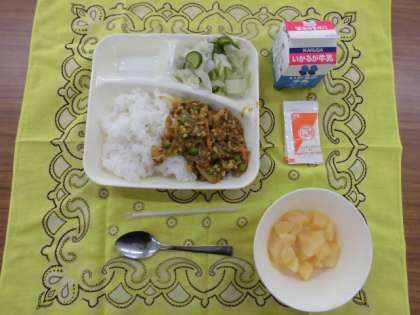 今日の給食の献立は、「大豆入りキーマカレーライス(米粉)、グリーンサラダ、白桃(缶詰)、牛乳」でした。