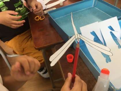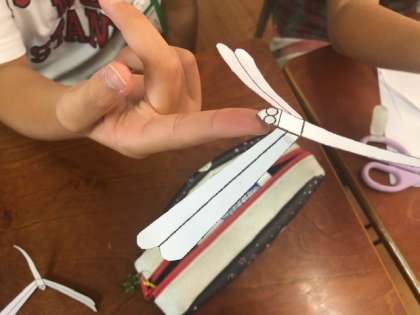 今日のクラブ活動では、科学工作クラブの子ども達が、このバランストンボを、厚紙で再現しました。指先でバランスを取る感覚に感動した子ども達。鉛筆の芯の上に上手にとまらせている児童もいました。