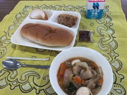 今日の給食の献立は、「あげきょうざ、中華煮、なし、パン、イチゴジャム、牛乳」でした。