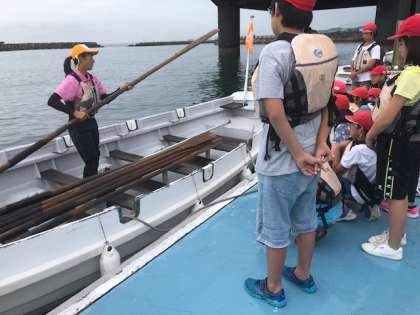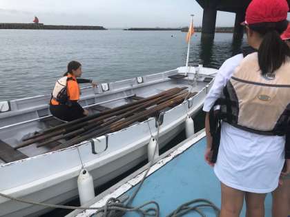 2艇に分かれて乗ります。乗り方、漕ぎ方、合図などを教えていただいています。