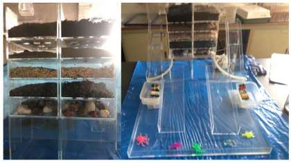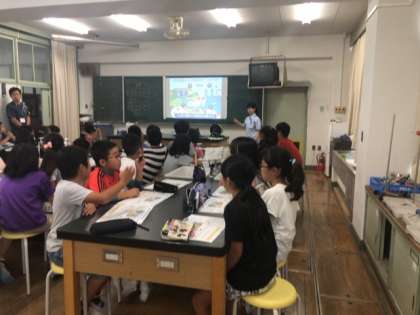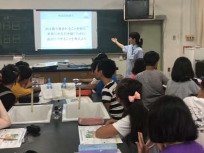 4年生が外部から講師をお招きして、水についての学習を行いました。森林が「水を貯え」「水を浄化する」ためにいかに大切な働きをしているのかをビデオやスライドを使って学びました。また、森林が水を浄化する様子がよくわかるモデルを使い、体験的に学習することもできました。