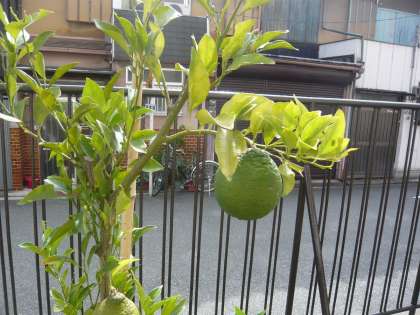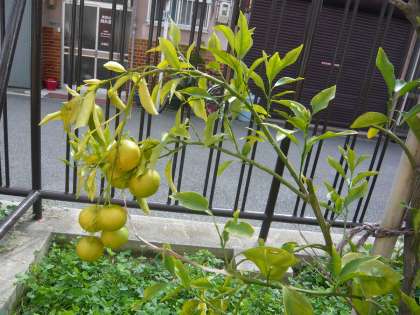 柑橘系の樹に、「はるみ」「ゆず」の実がなっています。