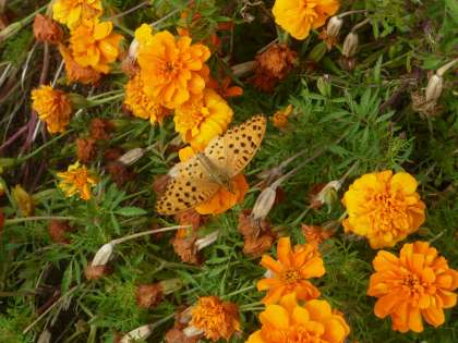 マリーゴールドがまだ咲いていて、ヒョウモンチョウが、花の蜜を吸っていました。