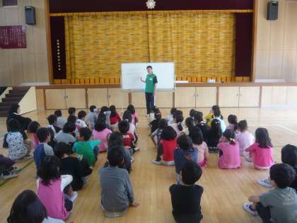 2時間に1・2年生が国際理解教育として、韓国・朝鮮について学習しました。講堂で本校の民族講師にあいさつの言葉や食事の時の「いただきます」などを教えてもらいました。