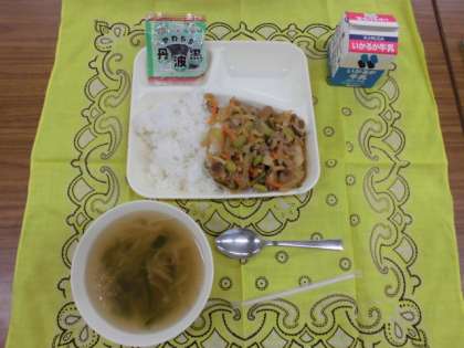 今日の給食の献立は、「ピリ辛丼、中華スープ、ソフト黒豆、牛乳」でした。