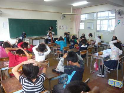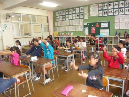 4年1組でも健康委員会の児童が前に立って、担任も含めて全員でのびのび体操をしていました。いつもどおり、体操が終わったら、みんな体はすっきりと伸びて、笑顔になっています。