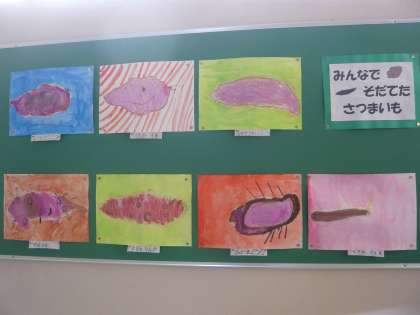 パスと絵具を使って、それぞれにさつまいもの形や質感を表現しています。